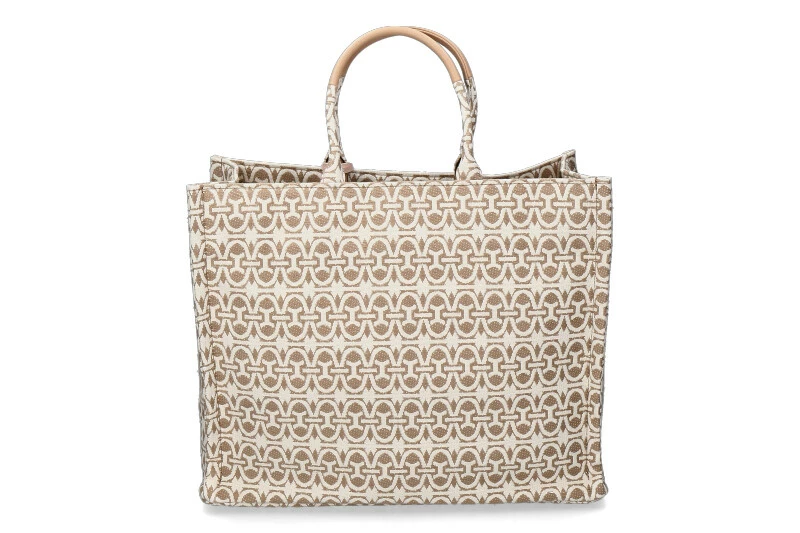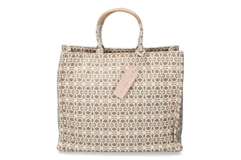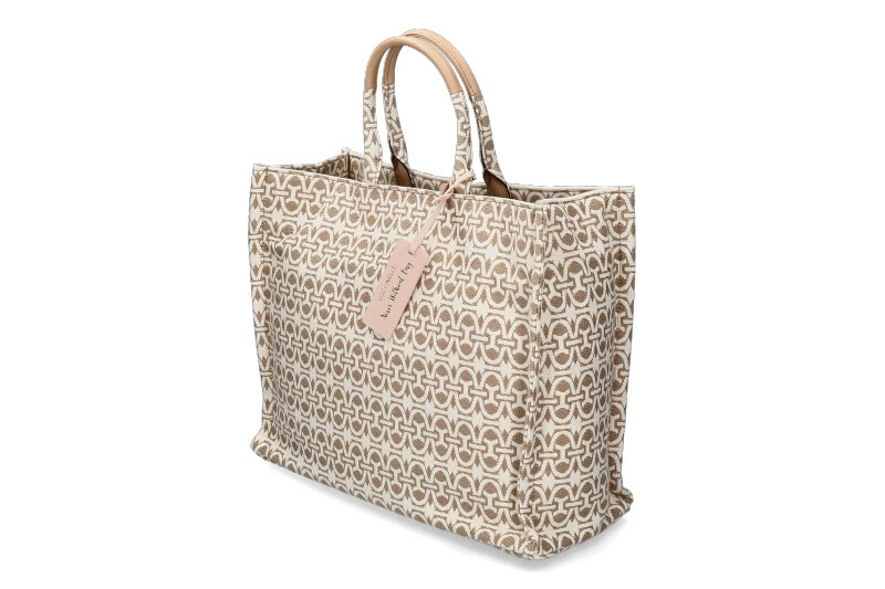 The NEVER WHITOUT BAG is a very special shopper with a proven form in ever new designs. The bag has a leather tag. It is a comfortable, spacious bag that women cannot do without. Inside compartments offer good storage possibilities. The bag can be closed with a magnet. The colours beige and cream can be perfectly combined. The handles are covered with leather. Dimensions: 41cm x 33cm x 16cm