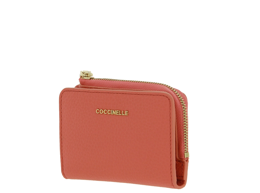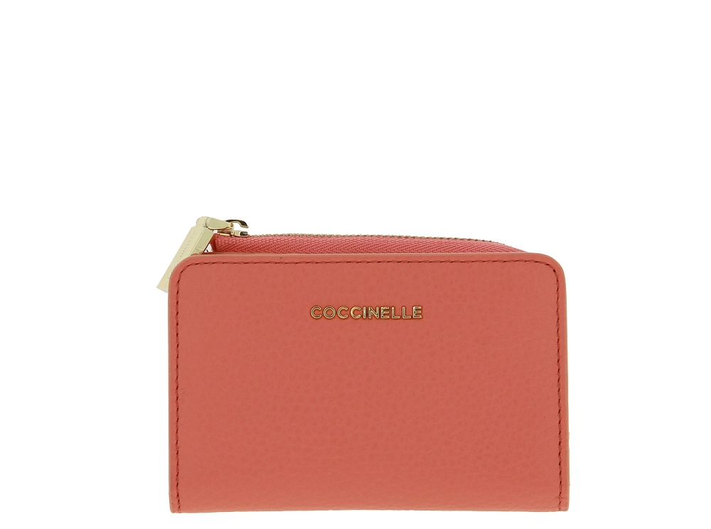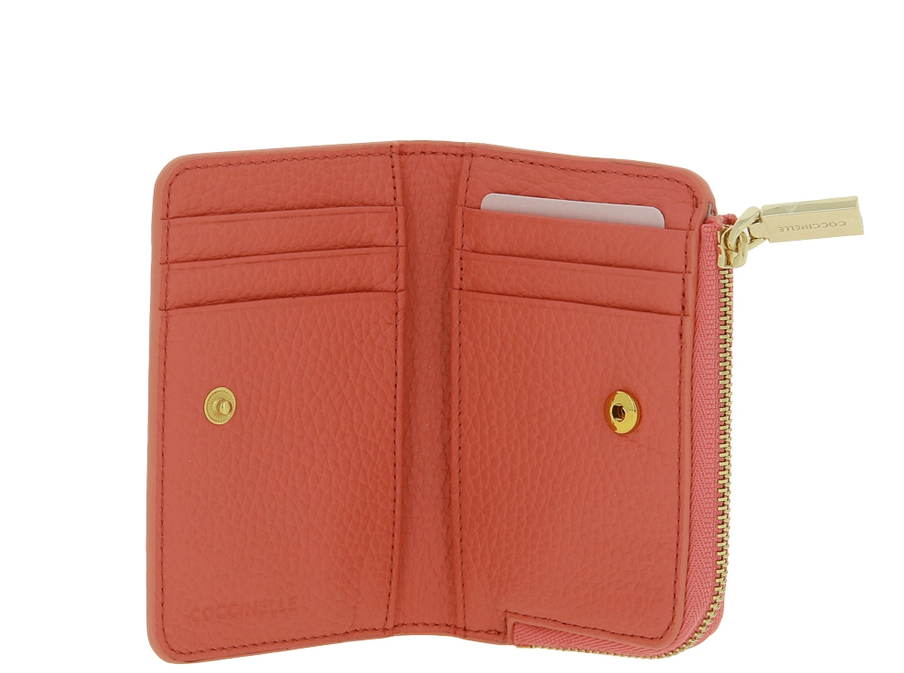 The wallet in a summery coral colour stands out with its logo in gold. Inside, there are six compartments for cards and two additional compartments for storage. There is a zipped compartment for coins. The wallet is made of high quality leather in Italy.